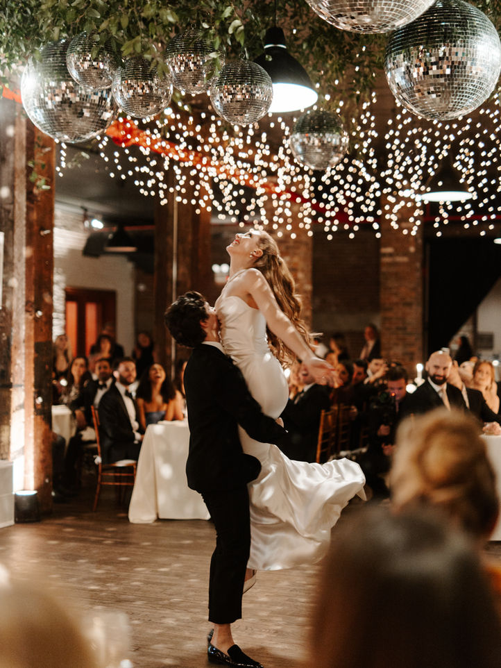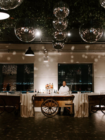 Monochromatic tone on tone white florals and lush seasonal winter greens filled the tables & ceremony. Complete with metallic textures such as champagne fern & dusty miller for a subtle holiday vibe. Pops of jewel toned color for the bridesmaid, their colors represented in the bridal bouquet. Chic ivory satin for the bridal gown with nods to old classic hollywood - pearl accessories & red lipstick. Velvet accents, & luxurious draping filling the space with glamour. All underneath an epic ceiling installation of wild smilax greenery & glistening disco balls for the ultimate NYE affair.